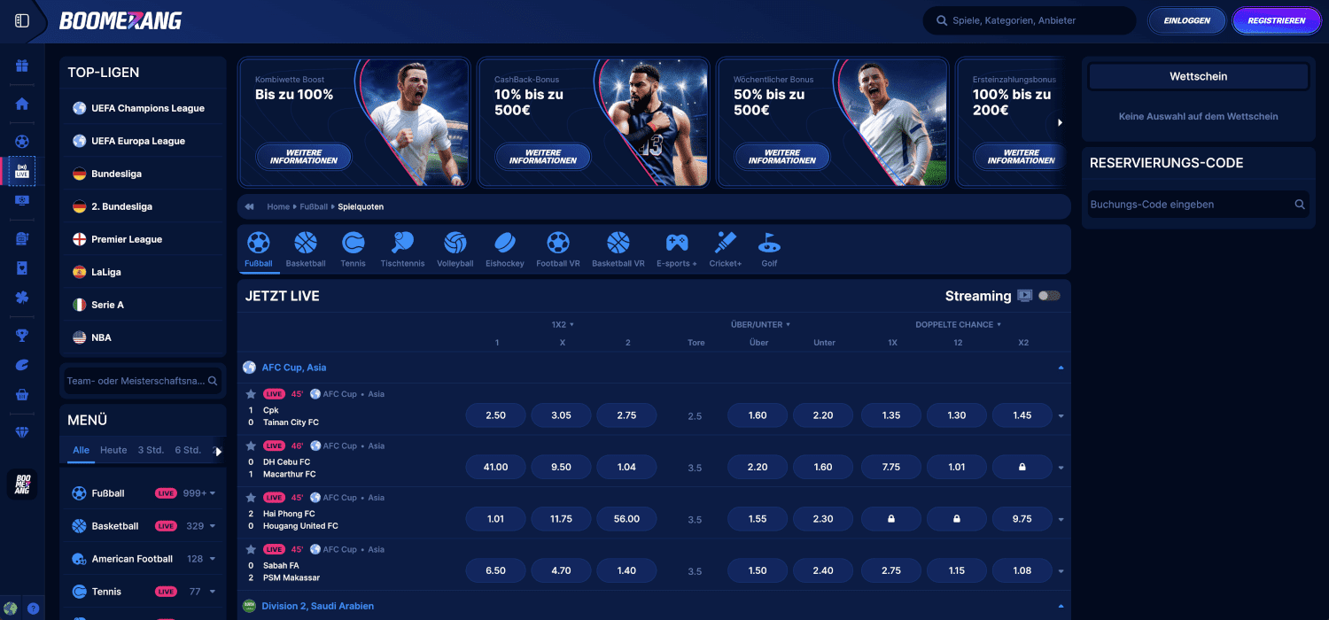 Wie bei den meisten europäischen Buchmachern dominiert auch bei Boomerang Bet der Fußball das Angebot. Die Abdeckung geht weit über die großen fünf Ligen hinaus. Neben Premier League, Bundesliga, La Liga, Serie A und Ligue 1 findest du auch unterklassige europäische Ligen, asiatische Wettbewerbe und südamerikanische Meisterschaften. Selbst afrikanische Ligen tauchen regelmäßig im Programm auf, was für Experten interessant sein dürfte.