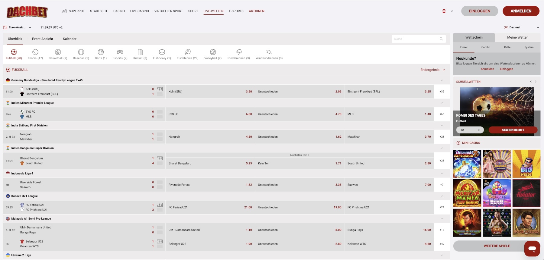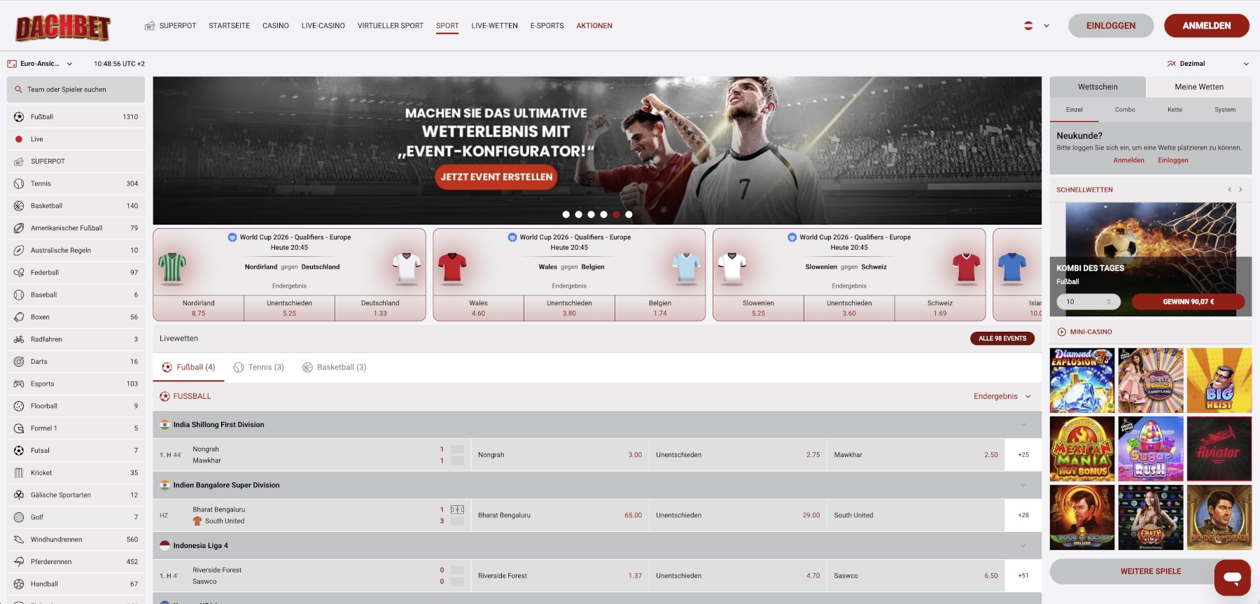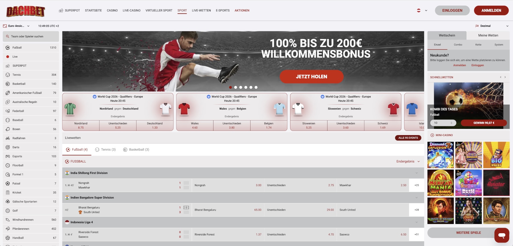 Dachbet ging 2021 an den Start und richtet sich mit seinem Namen gezielt an Tipper aus Deutschland, Österreich und der Schweiz. Die Lizenz läuft auf die Next Global Era Limited, im Impressum wird die Bellona N.V. (Curaçao) als Betreiber genannt. Die technische Infrastruktur liefert der B2B-Anbieter Delasport – ein Unternehmen mit über 400 Mitarbeitern, das monatlich mehr als 70.000 Prematch- und 40.000 Live-Events abwickelt. Was der Anbieter davon tatsächlich auf die eigene Seite bringt, wie die Quoten ausfallen und wo die Schwächen liegen, zeigt dieser Testbericht.