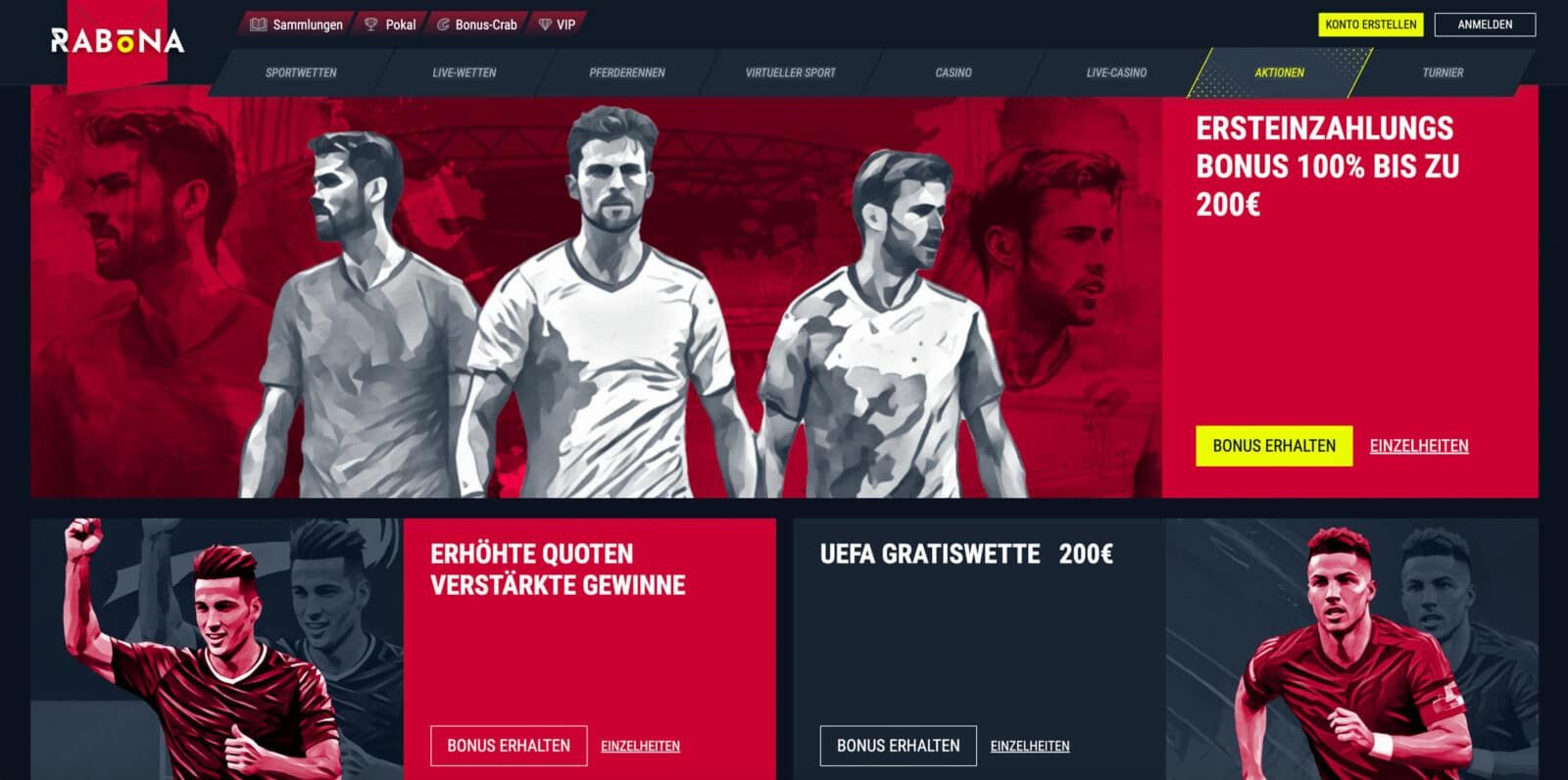 Neukunden können bei Rabona von einem großzügigen Willkommensbonus profitieren. Der Bonus besteht aus einer Verdoppelung der ersten Einzahlung bis zu einer Höhe von 200€. Ein Einzahlungsbetrag von beispielsweise 50€ würde also zu einem Bonusguthaben von weiteren 50€ führen, insgesamt stünden dem Kunden dann 100€ zum Wetten zur Verfügung.