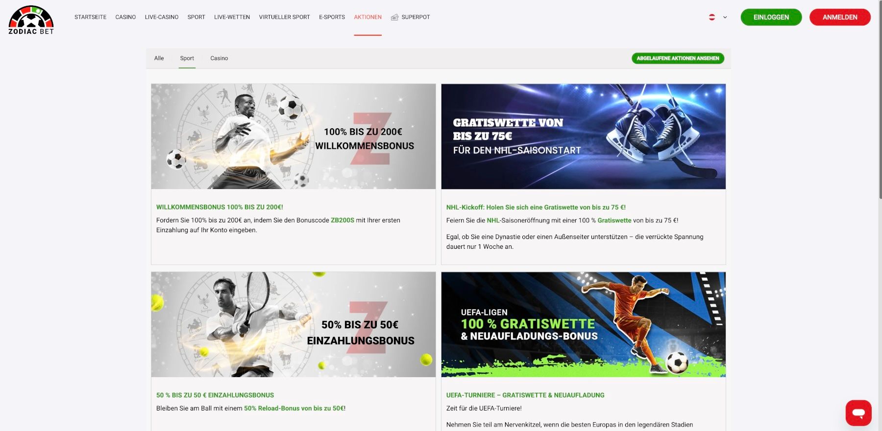 100% bis zu 200€ Bonus, bei der Einzahlung muss der Code ZB200S verwendet werden. Einzahlung und Bonus müssen 10-mal umgesetzt werden. Mindestquote 1.80. Zeit: 30 Tage. Max. Einsatz pro Wette: 50% des Bonusbetrags. Ausgeschlossen: Asian Handicap, Über/Unter, Quoten-Boosts.