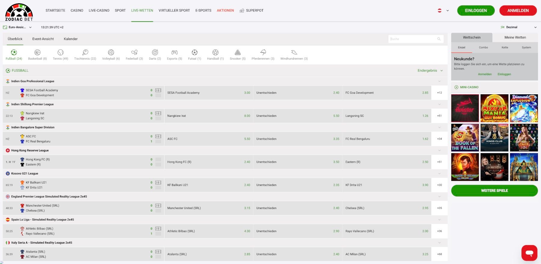 Das Sportangebot bei ZodiacBet ist ordentlich aufgestellt. Insgesamt stehen über 20 verschiedene Sportarten zur Auswahl. Der klare Schwerpunkt liegt auf Fußball, aber auch andere beliebte Sportarten sind gut vertreten. Diese Breite des Angebots macht ZodiacBet interessant für Tipper mit verschiedenen Interessen und Spezialisierungen.