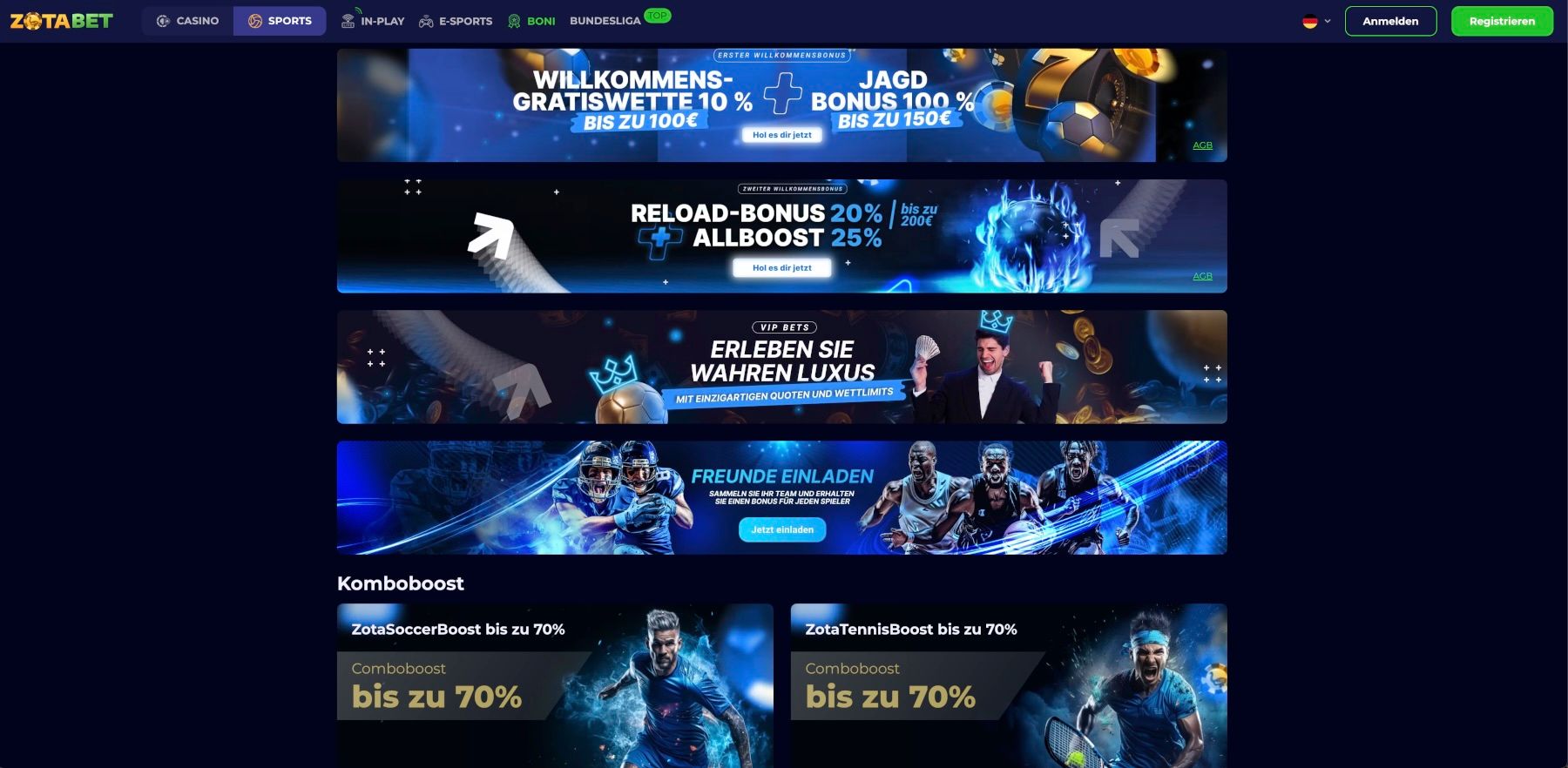 ZotaBet präsentiert sich als moderner Curacao-Wettanbieter mit einem außergewöhnlichen Bonusprogramm. Das Portfolio an permanenten Komboboosts ist beeindruckend und hebt sich deutlich von der Konkurrenz ab – mit bis zu 70% Quotensteigerung bei sportartspezifischen Boosts bietet die Plattform echten Mehrwert für Kombiwetten-Fans.