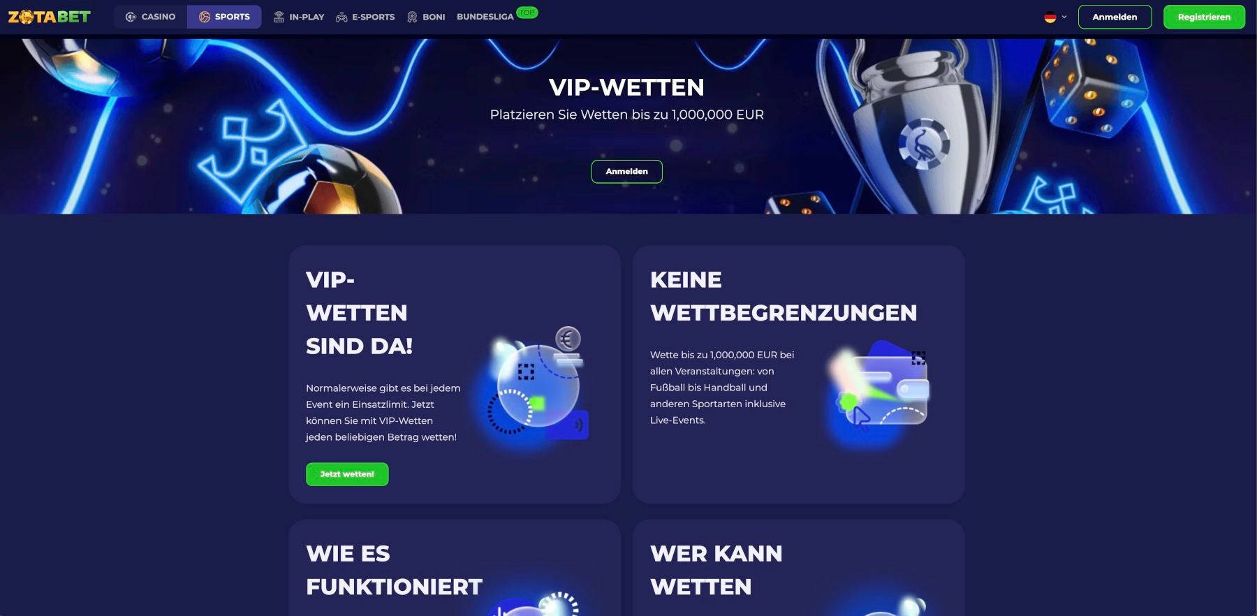 Was mich bei der Recherche überrascht hat: ZotaBet bietet VIP-Wetten bis zu einer Million Euro – und das für alle registrierten Nutzer, nicht nur für eine handverlesene Elite. Gleichzeitig stehen zehn Kryptowährungen ohne Einzahlungslimit zur Verfügung. Wer hohe Summen bewegen will, findet hier interessante Möglichkeiten.